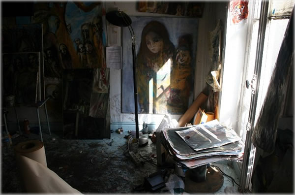|  Studio space at 59, Rue de Rivoli. Photo by Eric Francis Farewell, 59 AT SOME POINT when I was living in Paris, a friend named Mona took me for a walk one Saturday afternoon, across the river to the right bank and down Rue du Rivoli. She led me past the high-fashion shoe and clothing shops, though the mob and up to a red, pink and yellow door with the number 59 painted onto it, through the door, and into another world. Some casual looking but serious doormen were working the entrance, and had us sign the 'guest book', which turned out to be an accident disclaimer put there at the behest of the city. I think there was a urinal in the lobby. Inside was another kind of mob: people who showed up to visit the artists in residence at a famous squat that at the time had been there about six years. In other words, back in the fall of 1999, a bunch of politically charged, creatively hypercharged pranksters took up residence in an enormous abandoned building one day and basically set up shop. In case you're wondering how this can be, at least in Paris and London based on what I have heard from participants, it's considerably harder to get someone out of a space than it is for them to get in. Squatters actually change the locks, set up utilities and get mail. Through a combination of cleverness, persistence, sticking together and public adulation, the artists at 59 managed to hunker down for free and establish an institution of the folk-arts in an industrial space very heart of Paris. Inside for the first time, I had the typical response: being overwhelmed. People were calling it a squat, but until I learned the story, I had a really hard time grasping how you could just, you know, do this so overtly for so long. Paintings, sculptures and numerous indescribable combinations of the two, along with various mannequins, installations, concepts, scraps of metal, ideas, sketches, half done things, drawings, silk screen designs, baseball hats, shopping carts, carvings, curved mirrors and hunks of outdated technology exploded out of every doorway. Except, that is, for the meticulously maintained, wide-open studios that had more of a Zen feeling. This is evidence of what happens when you put in charge a bunch of people who honor creativity above everything else. People off the street who had heard a rumor about the place and showed up were poking their noses in everywhere, bustling up and down the spiral stairs that wound around a mobile of several thousand LP records dangling by a cable from the roof five stories down to the ground floor. Every Saturday was at that time open-house day, and most residents would get busy in their studios to greet the public. I dare say it was a zoo for artists. At some point, I wandered away from Mona and into a studio at the end of a corridor. There, a guy named Kit Brown, something of a giraffe who was in town from Philadelphia, was working on his ink drawings in a friend's studio while playing a recording of the Bulgarian Women's Choir on his Macintosh. We became friends on the spot, in that curiously beautiful American way. The Bulgarian Choir recording, which Kit burned and gave me, is still one of my favorites. Talking to him over the next couple of weeks, I began to piece together the story of 59 rue du Rivoli, and started meeting the people who lived and worked there. Paris is a beautiful space, but the pieces of it that would remind you of Picasso and James Joyce are few and far between. They exist, yes. But most of what is fermenting is wine, not creativity. At 59, it was amazing and inspiring to walk in on a group of working artists who were also willing to get together and not just demand the right to exist, but take it for themselves. e | ||||||
